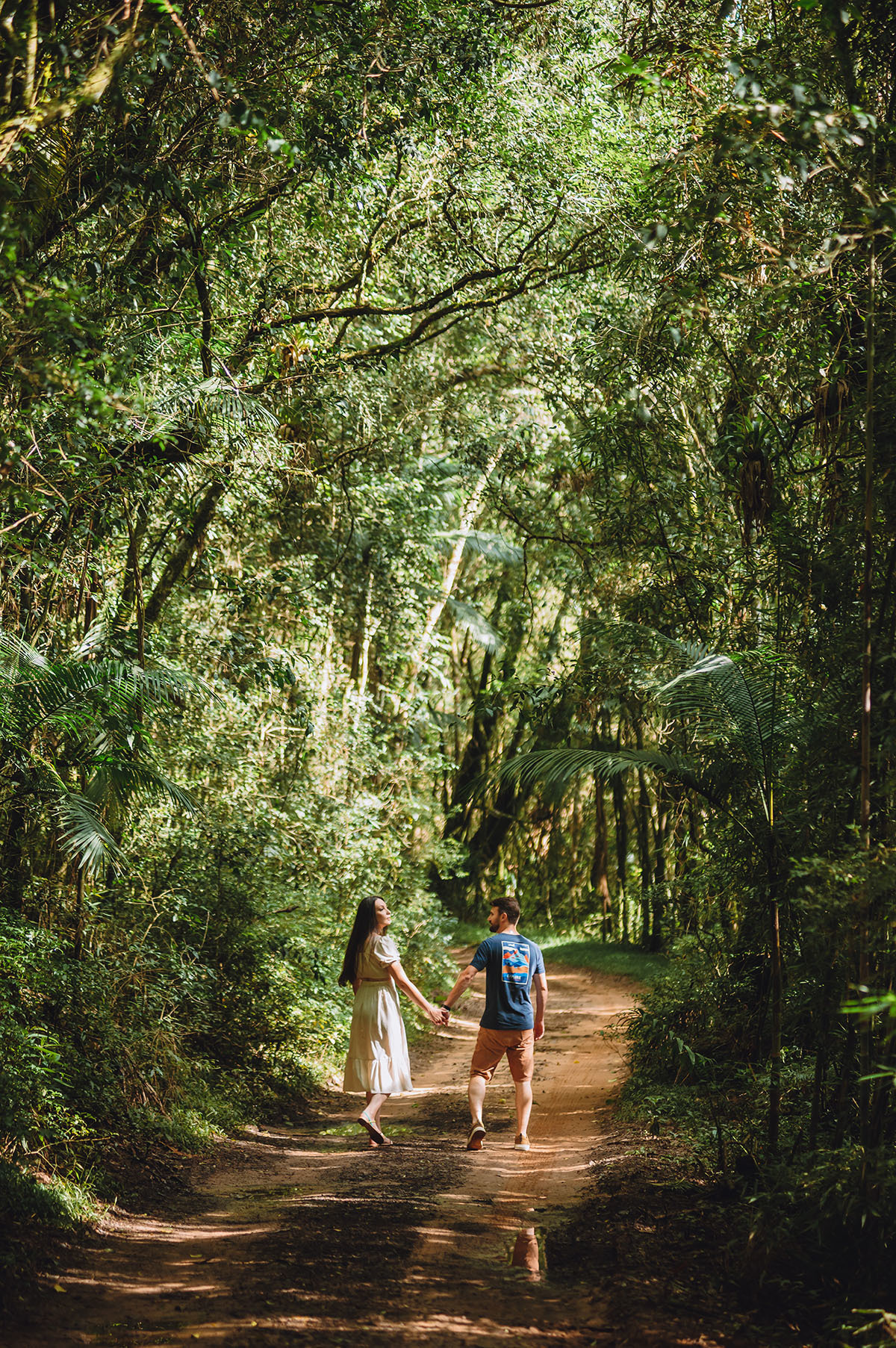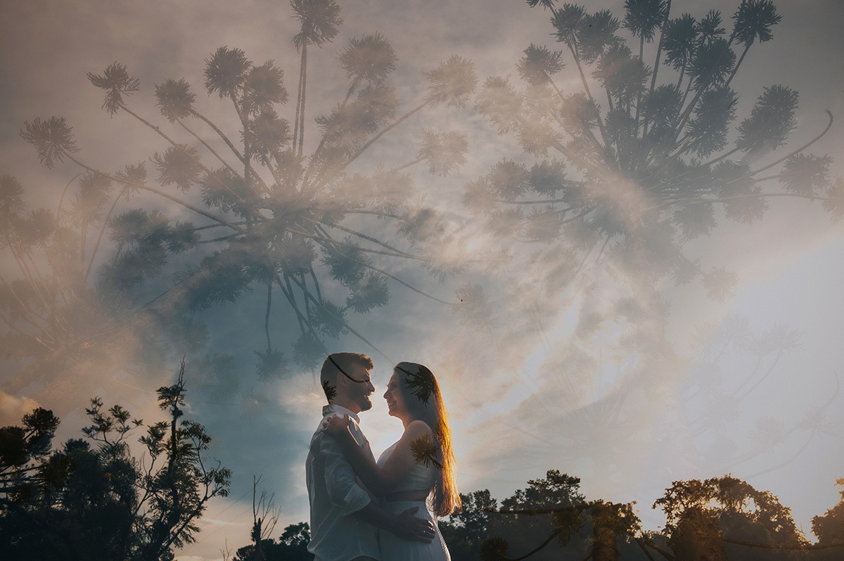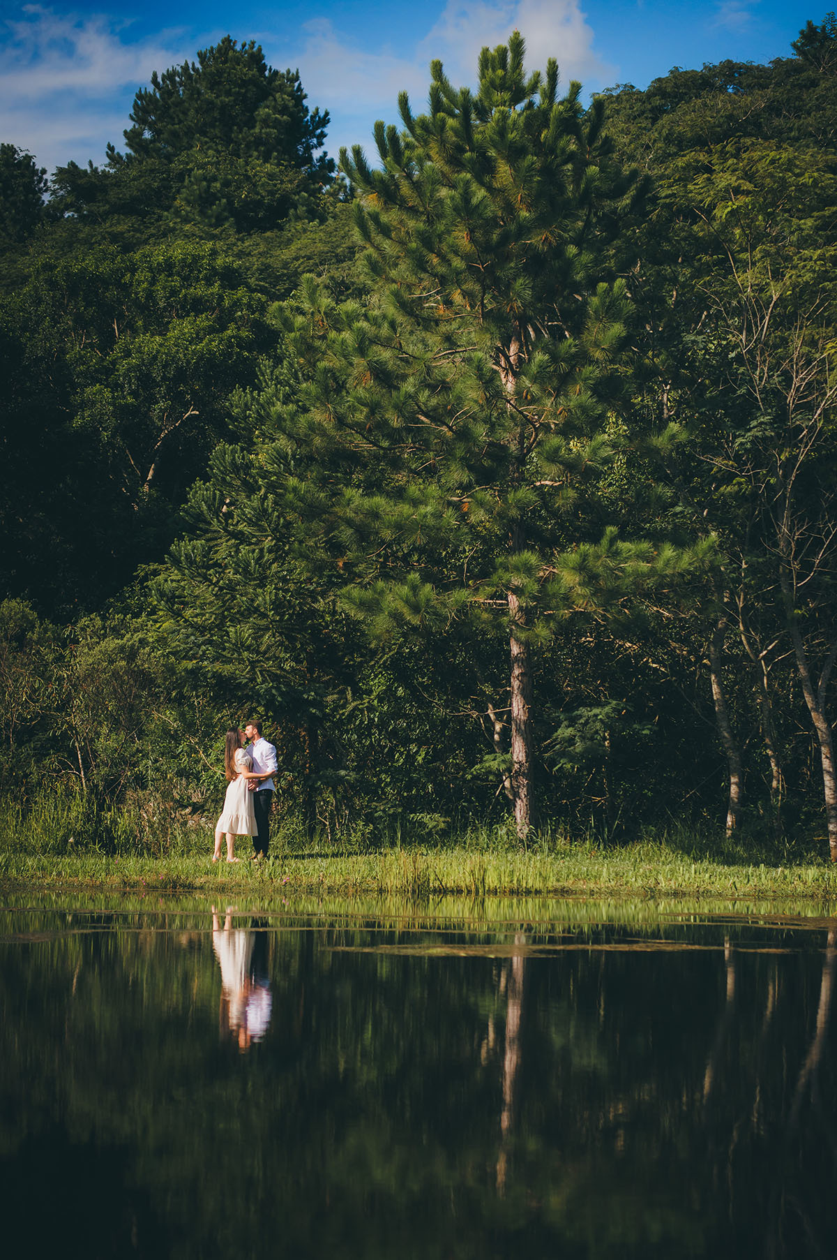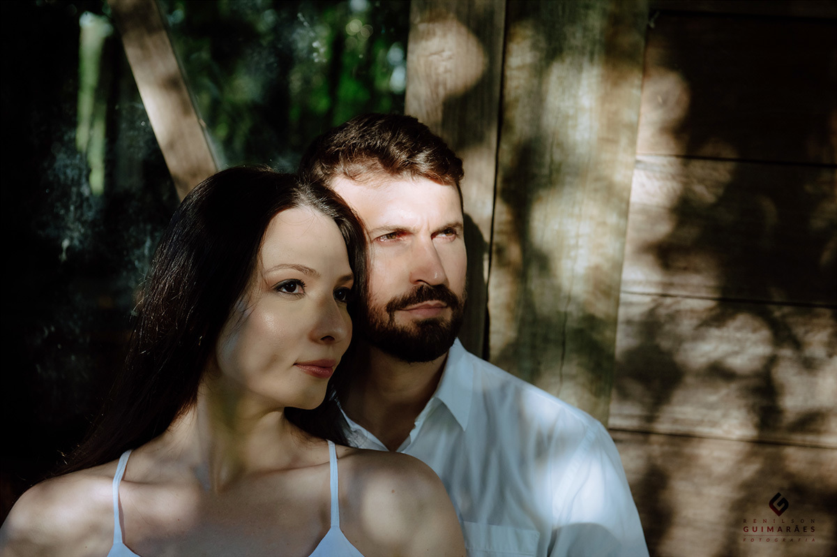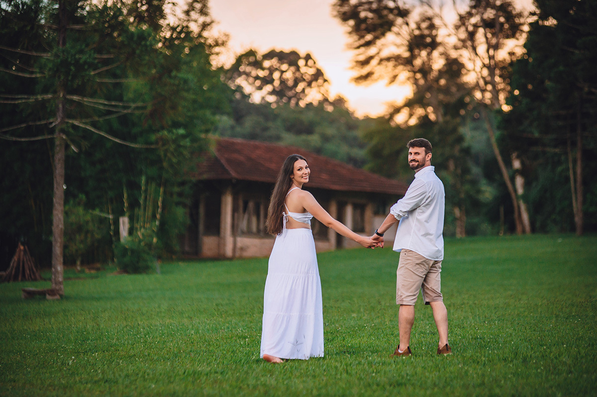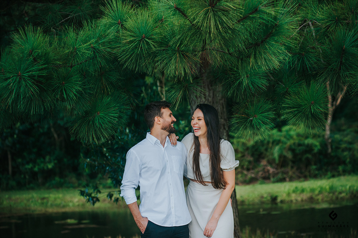Os noivos curtem muito a natureza, por isso escolheram o Recanto Pinhão, por ter vários locais diferentes que deixam o ensaio com cenas diversificadas e com uma experiência incrível. De um lado, tem um lago calmo, no meio tem alguns chalés, que podem ser usados para se hospedarem também, e do outro, uma linda cachoeira.