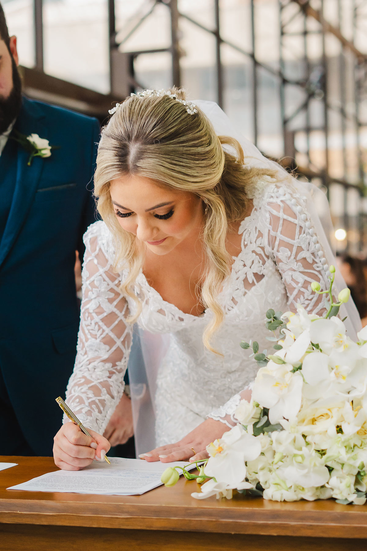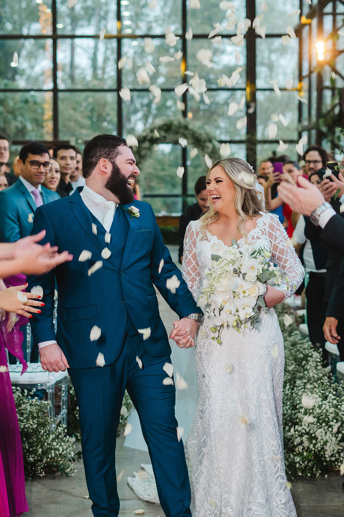 O casamento da Sarah e do Augusto foi daqueles que a gente sente no coração! 💛 A previsão era céu aberto, mas São Pedro resolveu dar a sua benção em forma de chuva. O que poderia ser um problema virou um detalhe charmoso, porque a cerimônia foi realocada para o interior do Ballroom Moress, um espaço todo de vidro, que fez tudo ficar ainda mais mágico!